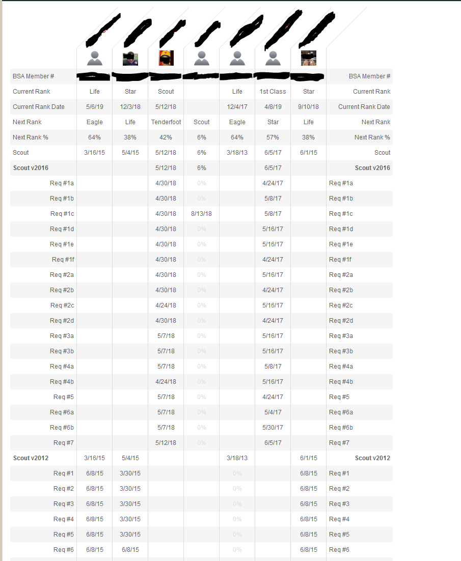 Note that, since I have scouts in the same patrol with different rank versions (e.g. some completed Scout prior to the 2016 version, some since then) I will get duplicate entries for each of the ranks. I don’t find this particularly helpful myself, but I understand why it’s there.