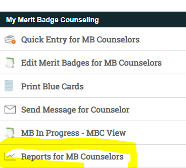 Reports for MB Counselors. The issue really is that when the scout starts the badge and is assigned a counselor, it doesn’t specify the year of the requirements. (It does select the most recent.)