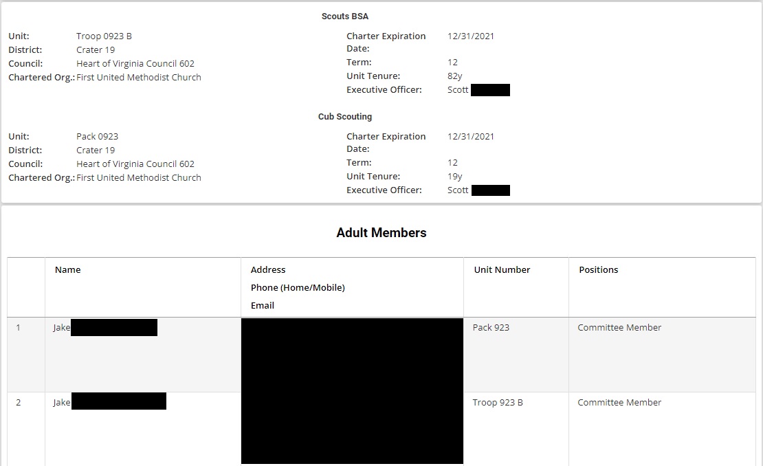 The resulting report lists both the Troop and Pack at the top, and if the Pack adult is also registered in the Troop, they appear on the report twice, once with their Pack position, and again with their Troop position.
