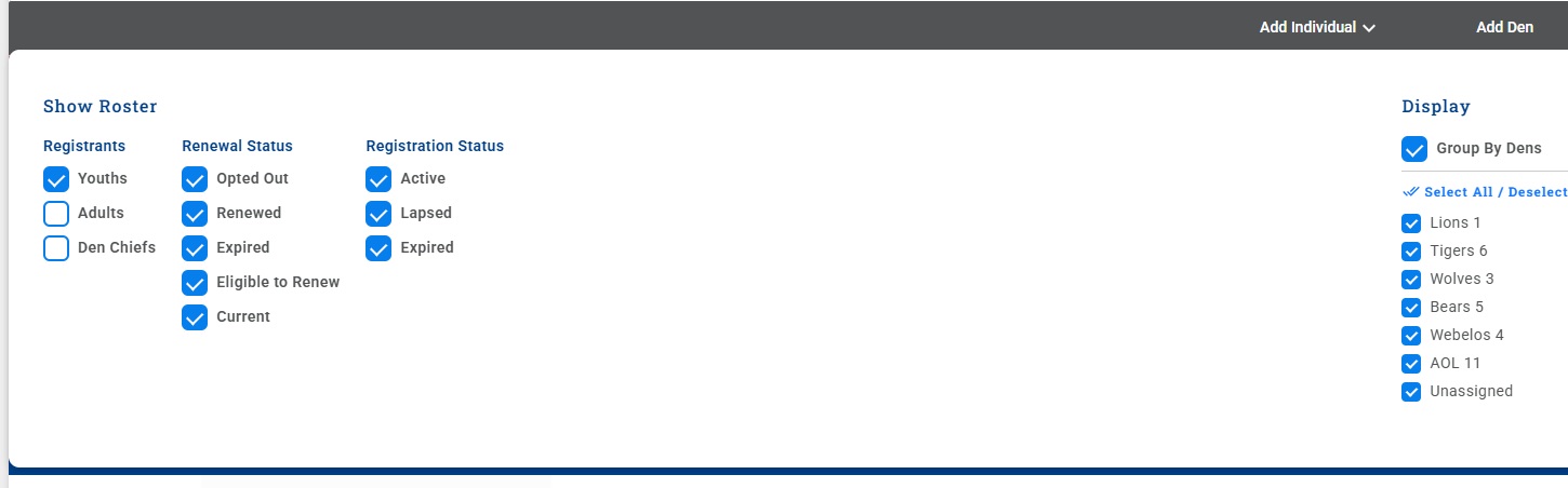 Finally, when I view the roster via a custom report (on my.scouting.org, linked via Scoutbook Plus), it shows all the scouts assigned to the correct dens, including my missing scout.