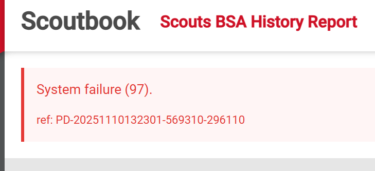 Oops, I deleted the image showing a scout’s name. I am also unable to create an activity report for scouts in order to view advancement, I get a system error.